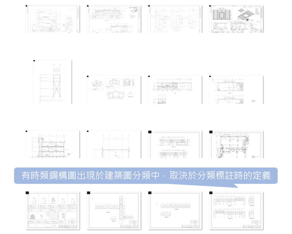 當分類依據來自流程語意而非視覺特徵時,要求影像模型提供穩定分類結果,本身即存在先天限制。就像起初以平面/立面/詳圖 的定義去作分類標註,其實是按著圖面內容的「畫法」、「視覺特徵」去區分: