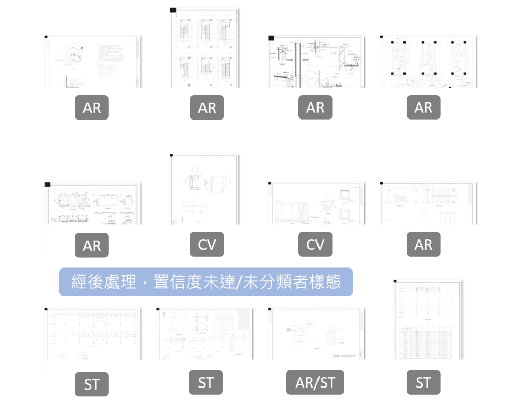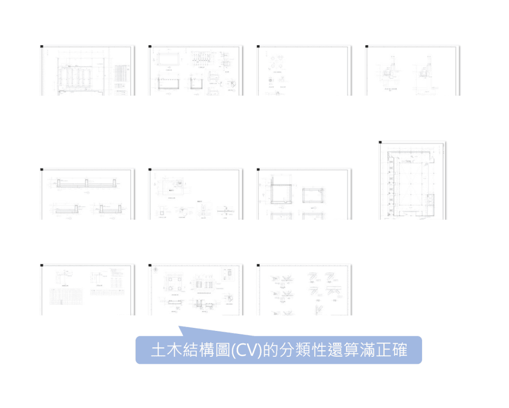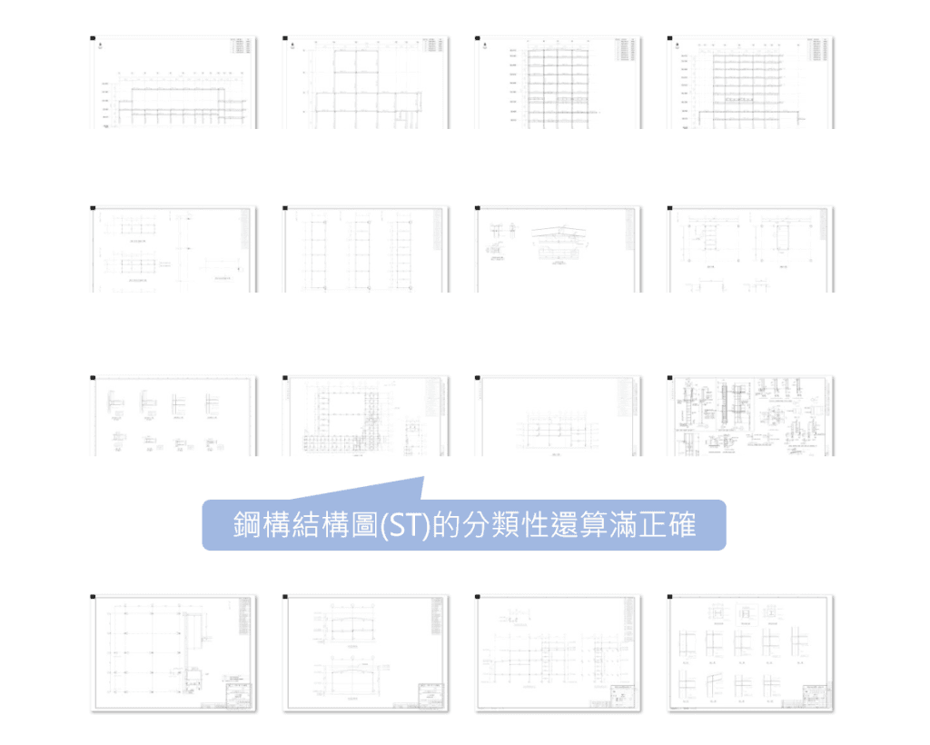 - 鋼構圖(ST)、結構圖(CV)可以正確的按平面圖、立面圖、詳細圖等被分類,惟資料集樣本數較小而限制了模型的成效